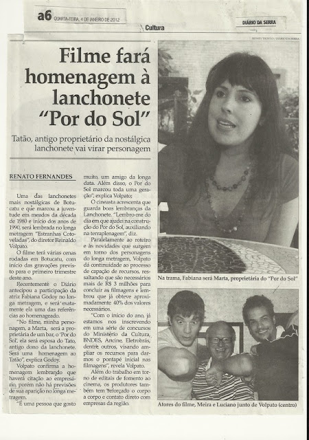 Começamos o ano com o pé direito, as mãos e a cabeça também. Depois de um descanso merecido, vemos nosso filme aparecer em uma grande reportagem no Diário da Serra (04.01), com a nossa artista local Fabiana Godoy falando sobre a personagem que vai representar no filme. Fabiana será Marta, dona do bar Por do Sol, e esposa do Tato, que no filme se diverte com sua esquadrilha de aeromodelos. Os nomes e os personagens são uma referência direta a lanchonete que marcou a juventude de Botucatu na década de 1980 e início dos 1990, que o diretor Reinaldo Volpato frequentou e ajudou a construir.